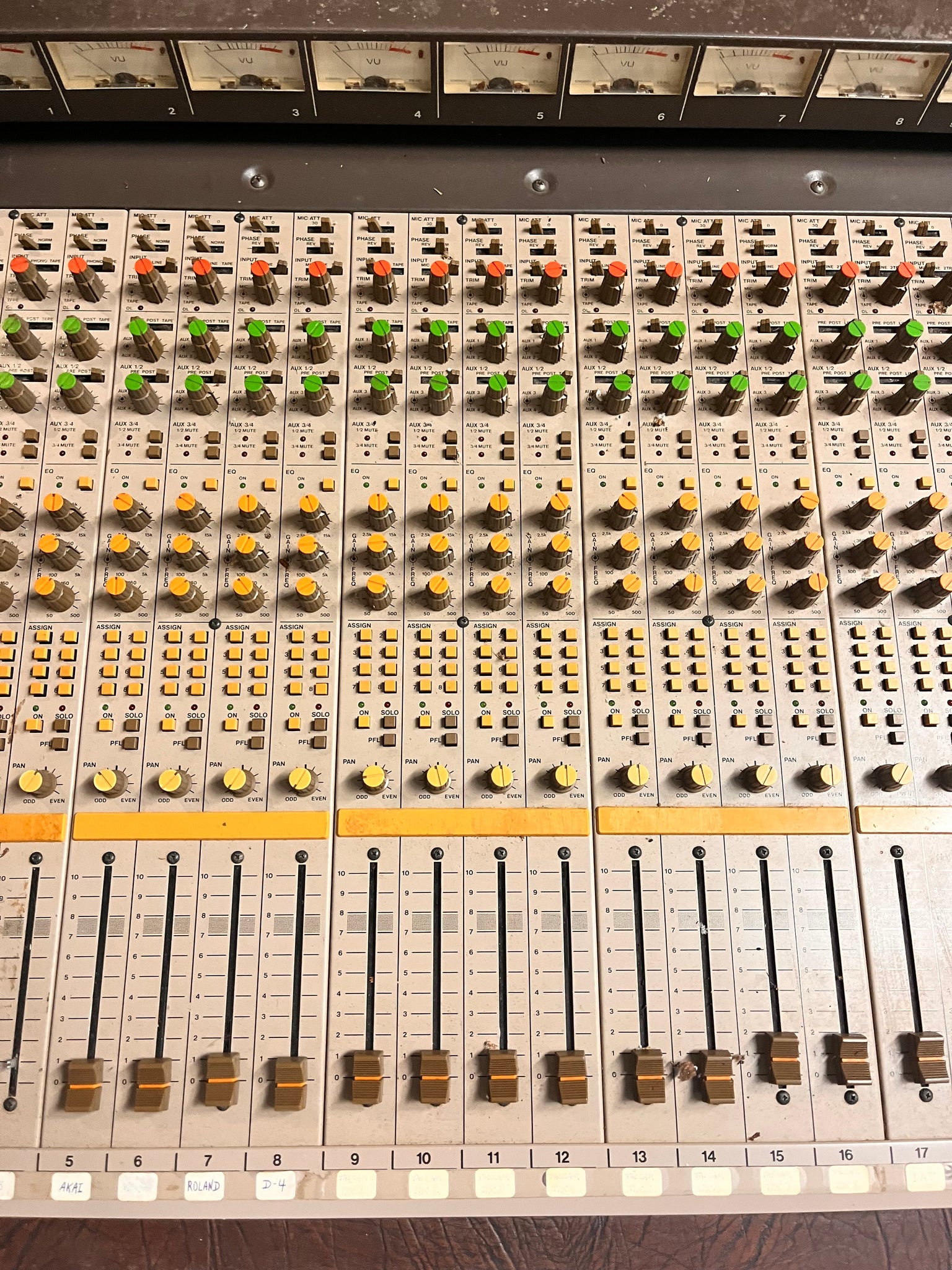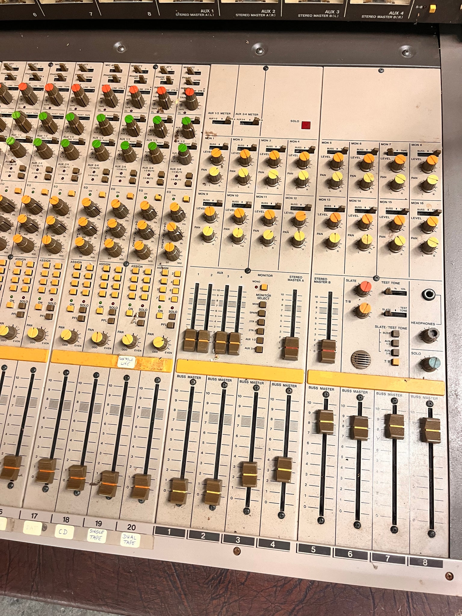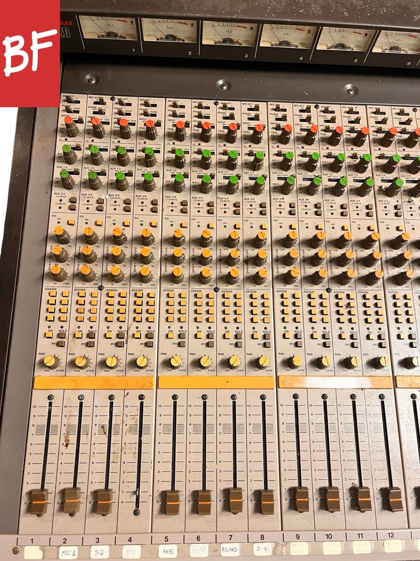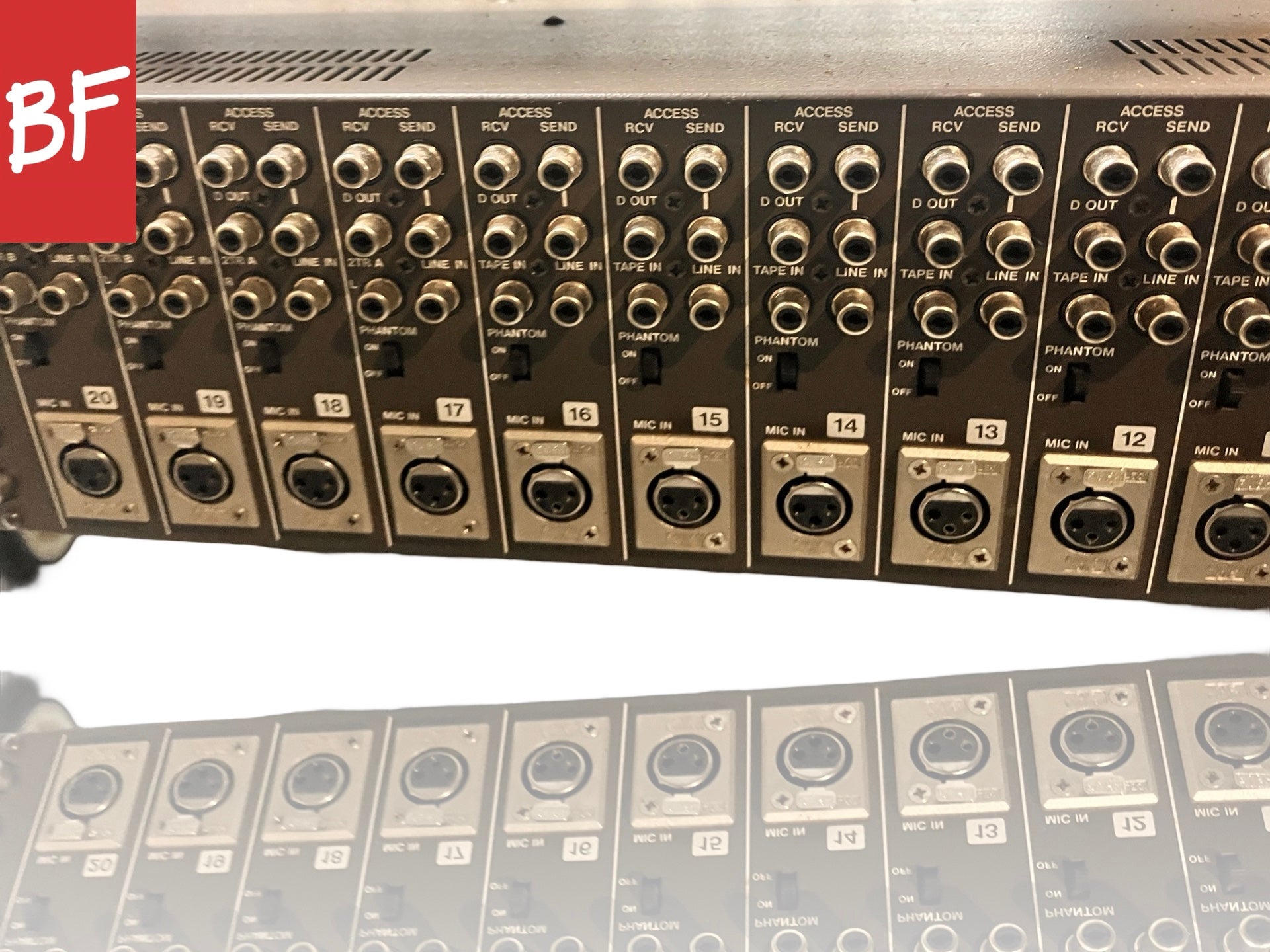 Good condition. Made in Japan. 20 channels with full separate tape return section. Previously used in a studio but has been in storage. Phantom power, RCA direct outs, 3-band parametric EQ, pan, solo, PFL, mic/line/tape ins, phase flip, 4 aux sends, and channel mute on all channels. Talkback, oscillator, headphone out. 8 bus outs with other outputs as well. Includes power supply but is missing power supply cable. Missing one channel fader cap. Has not been tested due to missing power cable. Sold as-is.