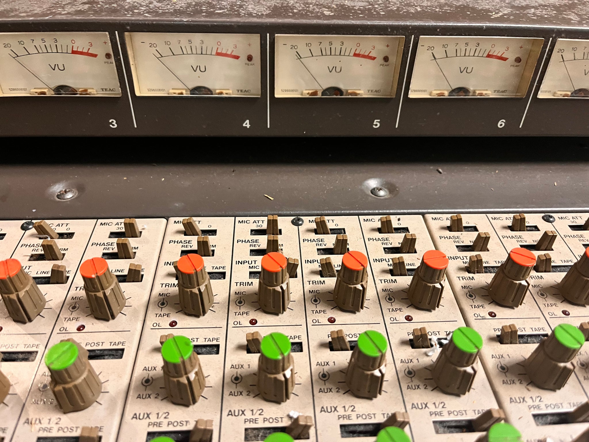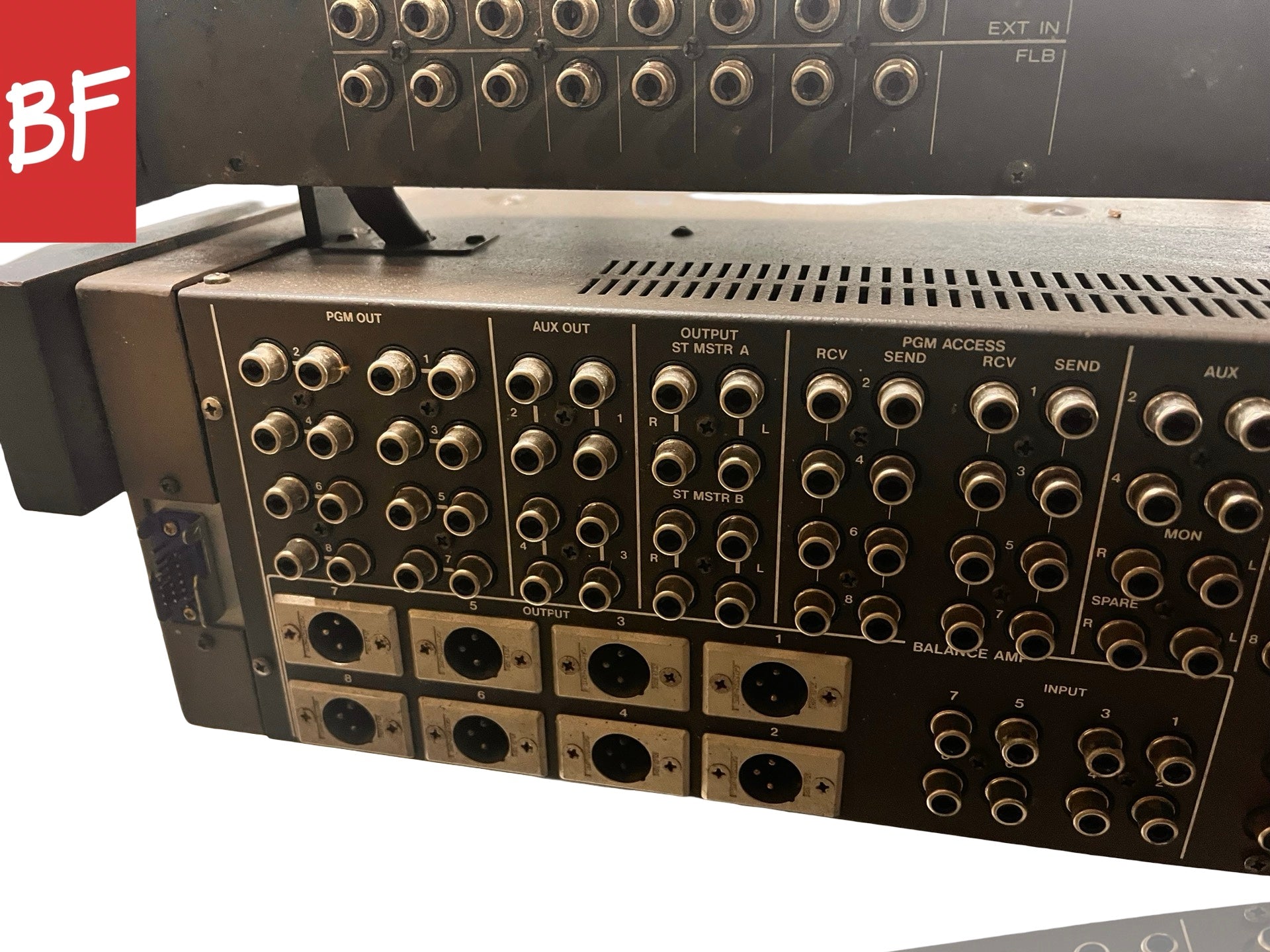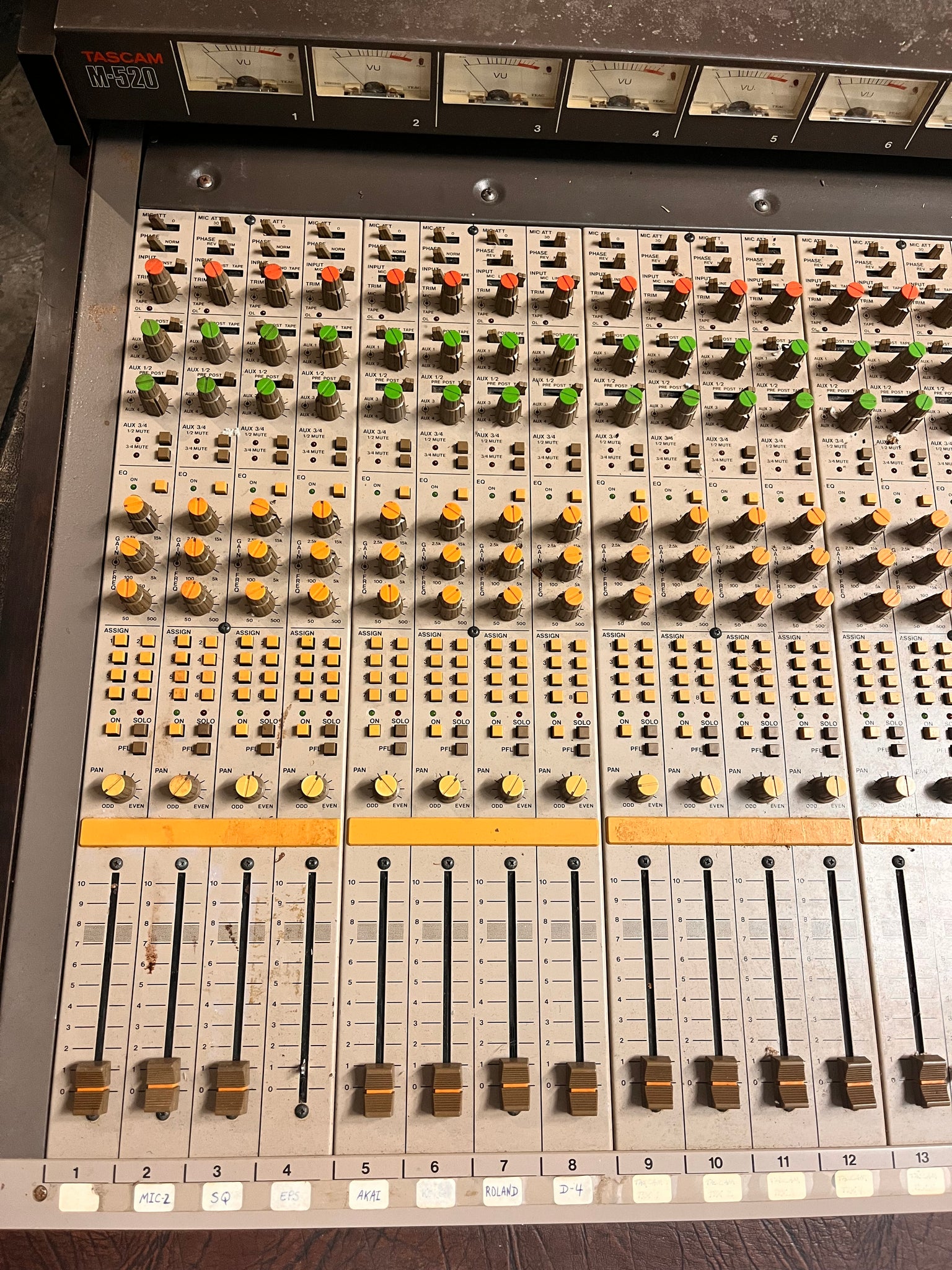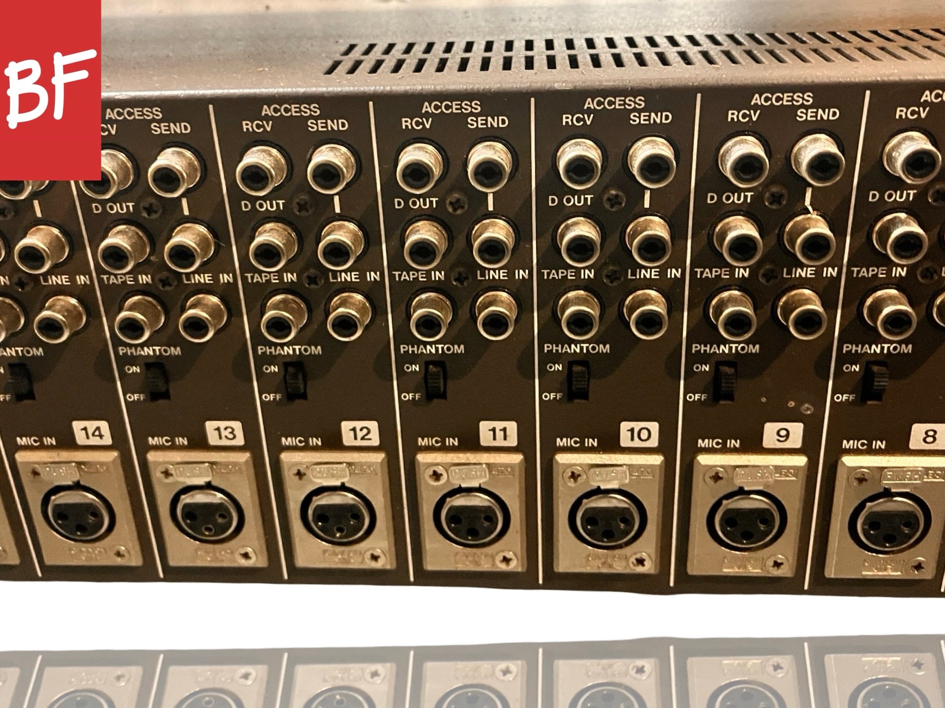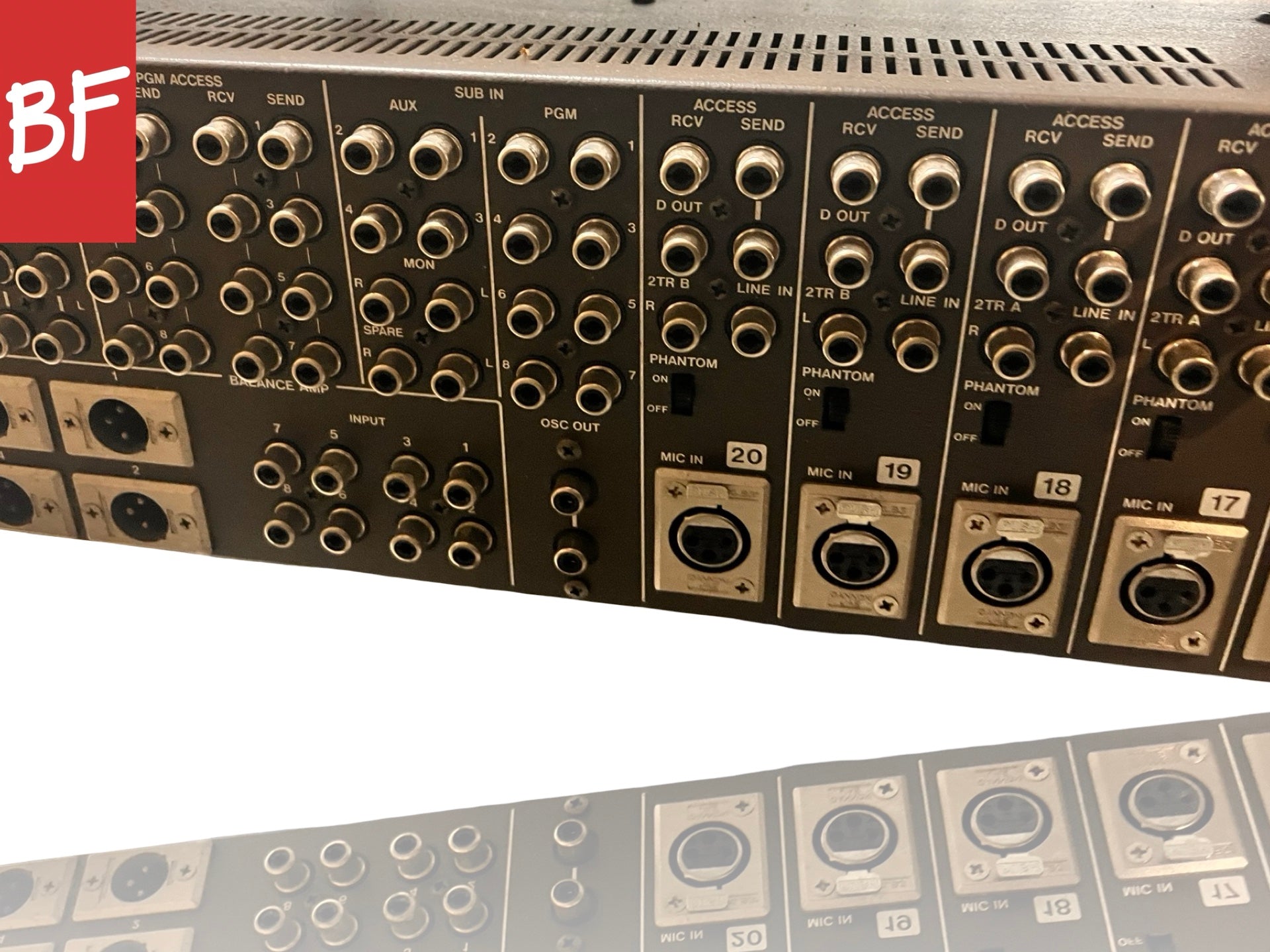 Good condition. Made in Japan. 20 channels with full separate tape return section. Previously used in a studio but has been in storage. Phantom power, RCA direct outs, 3-band parametric EQ, pan, solo, PFL, mic/line/tape ins, phase flip, 4 aux sends, and channel mute on all channels. Talkback, oscillator, headphone out. 8 bus outs with other outputs as well. Includes power supply but is missing power supply cable. Missing one channel fader cap. Has not been tested due to missing power cable. Sold as-is.