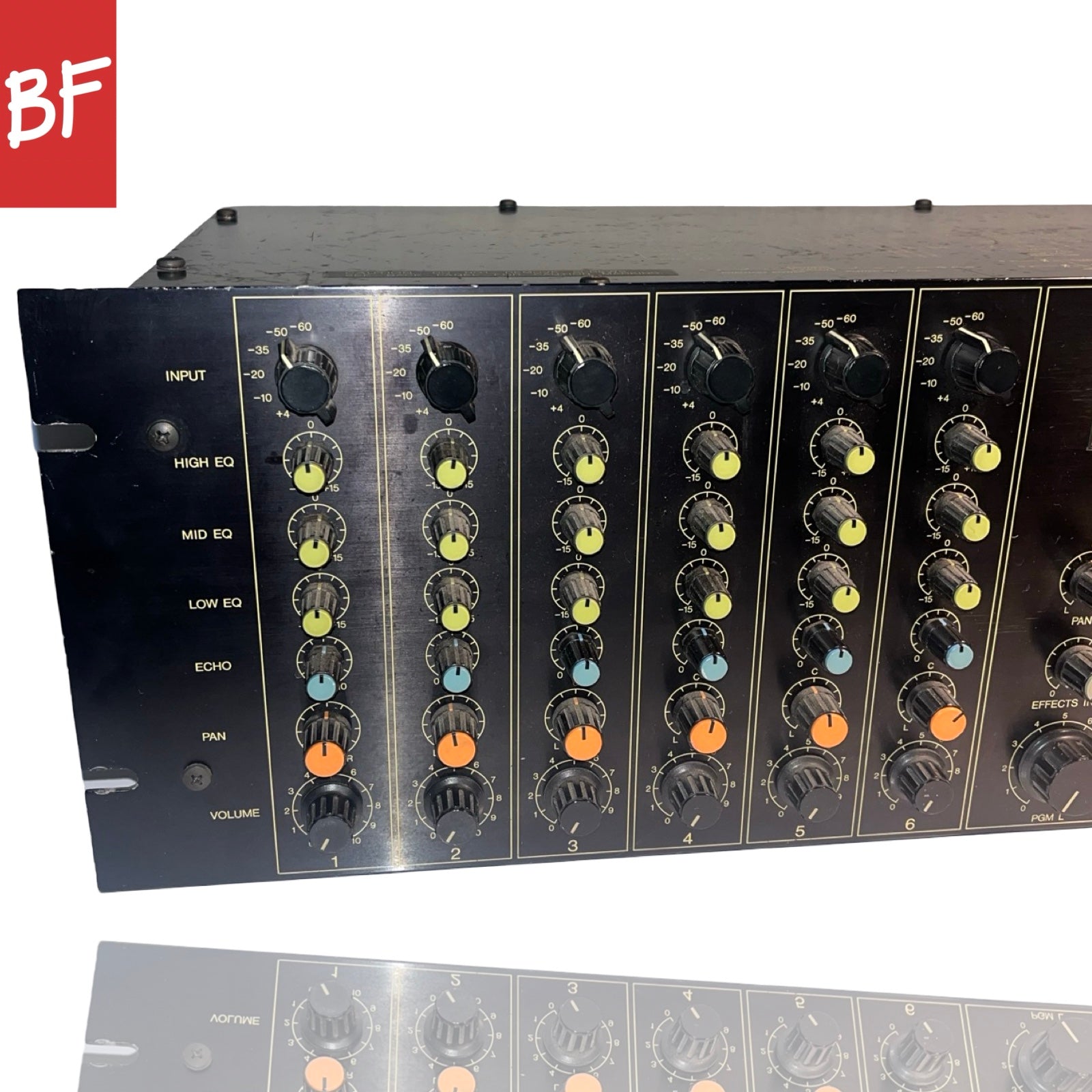 Analog rackmount console with stepped input gain knobs, useful 3-band EQs, and channel volumes, echo send, and L/R busses